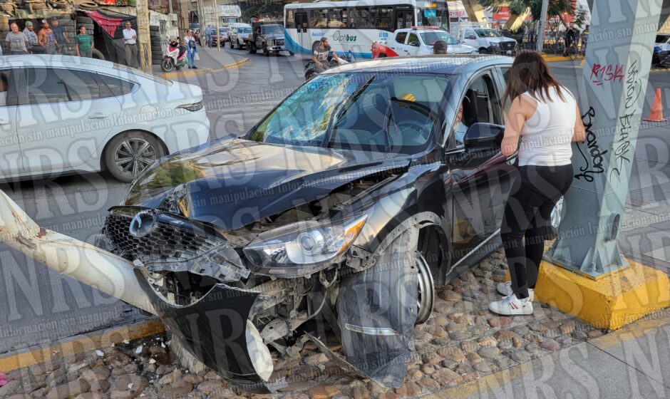 León, Gto.– Cerca de las 5 de la tarde de este viernes se registró un fuerte accidente en el cruce del bulevar José María Morelos y bulevar Ibarrilla, donde una motocicleta con dos jóvenes a bordo se impactó contra una camioneta y provocó una carambola que terminó con un vehículo incrustado contra un poste de alumbrado público.